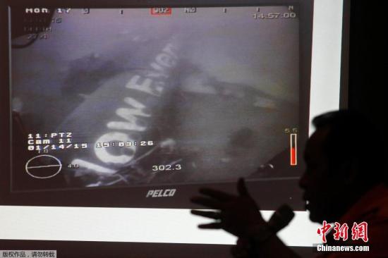 資料圖:當地時間2015年1月14日,印尼雅加達,印尼國家搜救隊召開新聞發布會,展示新加坡海軍提供的亞航QZ8501航班機身圖像。