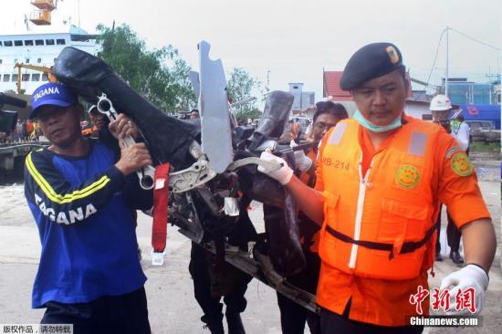當地時間2015年1月(yue)19日(ri),印尼(ni)加(jia)里曼(man)丹,庫邁港,印尼(ni)國家搜救(jiu)機(ji)構工作人員(yuan)正(zheng)抬(tai)著(zhu)一(yi)個打撈(lao)上來的飛機(ji)座椅(yi)殘骸。