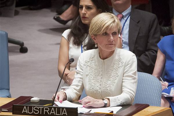 ↑2015年7月29日(ri),在位于美國紐約的聯合國總部(bu),澳(ao)大(da)利亞外交部(bu)長畢曉普(前(qian))在安理(li)會上發言。