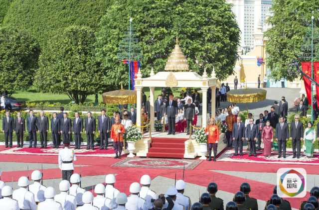 習近平出席西哈莫尼在王宮舉行的盛大歡迎儀式。(新華社記者王曄攝)