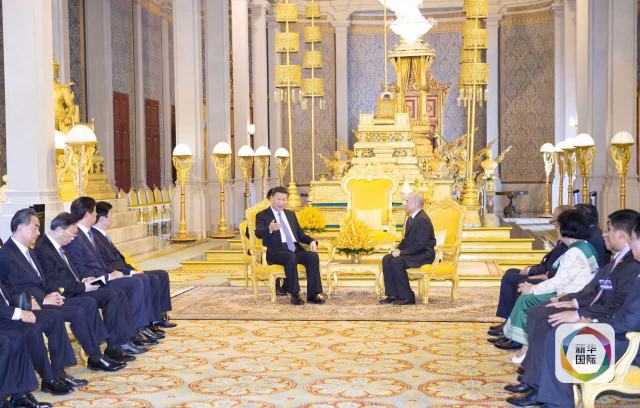 習近平在金邊會見柬埔寨國王西哈莫尼。(新華社記者謝環馳攝)