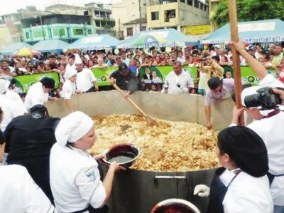 克(ke)韋多(duo)市(shi)作為“炒冷飯”的(de)故鄉,為了(le)推(tui)廣國(guo)內(nei)和國(guo)際旅游,在(zai)2013年還曾做(zuo)過一個世界最大的(de)“炒冷飯”。當時(shi)使用(yong)的(de)鍋直徑4米,深1.5米,使用(yong)的(de)食材有500公斤(jin)大米、1000個雞(ji)蛋、50升油、三大桶醬油,還有上百公斤(jin)的(de)雞(ji)肉、蝦仁等,40多(duo)名廚(chu)師學(xue)校的(de)學(xue)生一起參與了(le)制作。現場數千民眾(zhong)隨后一起享用(yong)了(le)這個巨無霸(ba)“炒冷飯”。