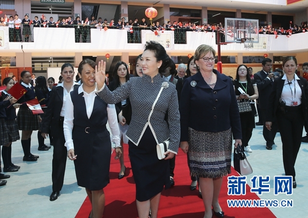 11月21日,國家主席習近平夫人彭麗媛在利馬參觀若望二十三世秘中學校。 新華社記者丁林攝