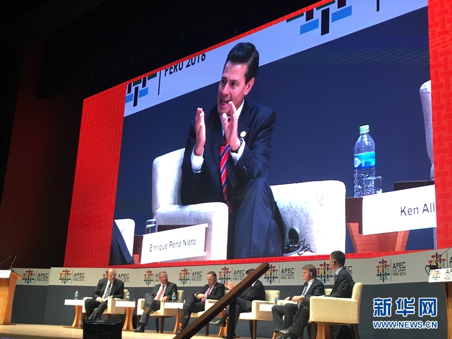 ????新華網北(bei)京11月22日電(dian) 當地時間11月19日,APEC工商領導人峰會(hui)(hui)舉(ju)行(xing)主題為“重新設(she)計貿易”的現場(chang)討論會(hui)(hui)。圖為墨西哥總統涅托在(zai)討論會(hui)(hui)上發(fa)言。