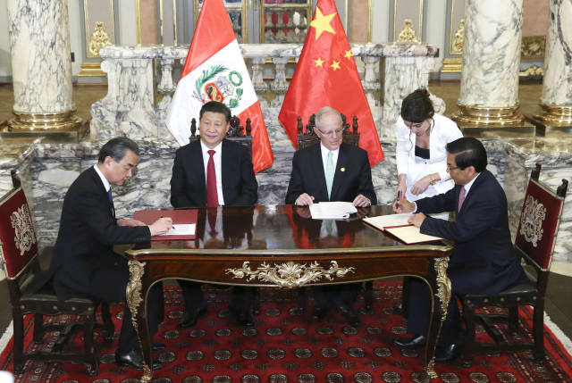 11月21日,國家主席習近平在(zai)利馬(ma)同秘魯(lu)總統(tong)庫(ku)琴斯基舉行會談。會談后,兩國元首(shou)見(jian)證《中(zhong)華人民共和(he)國政(zheng)府與秘魯(lu)共和(he)國政(zheng)府2016年至2021年共同行動計劃》等(deng)文(wen)件的簽(qian)署。(新華社記者 龐興雷 攝)
