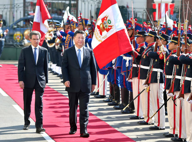 11月21日,國(guo)家主席習近(jin)平(ping)在利馬會(hui)見秘魯(lu)國(guo)會(hui)主席薩爾加多。習近(jin)平(ping)抵(di)達國(guo)會(hui)時,軍樂(le)隊奏歡(huan)迎曲。習近(jin)平(ping)檢閱儀仗隊。(新華社記者 李(li)濤(tao) 攝(she))