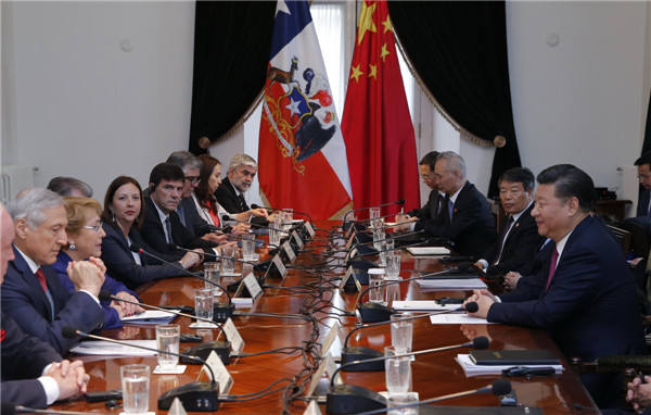 11月22日,國(guo)家主席(xi)習(xi)近平(ping)在圣地亞哥同智(zhi)利總統巴切萊特舉行會談。(新(xin)華社記者 鞠(ju)鵬 攝)