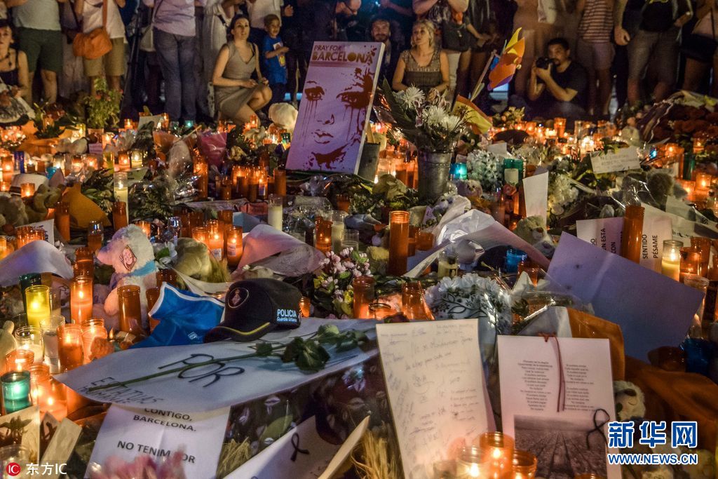 當地時間2017年8月18日,西班牙巴塞羅那,當地民眾點燭獻花悼念恐襲事件遇難者。17日,一輛白色貨車在巴塞羅那市中心蘭布拉大道加泰羅尼亞廣場附近沖撞人群,據媒體報道,死亡人數已經升至14人。(圖片來源:東方IC)