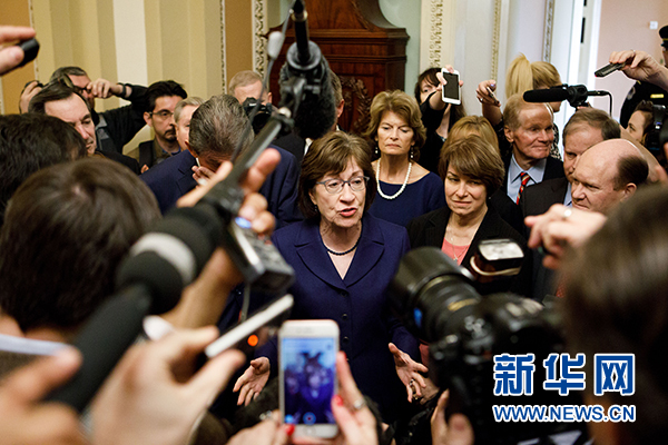 1月22日,在美國華盛頓國會山,參議員蘇珊·柯林斯(中)被記者包圍。新華社發(沈霆攝)