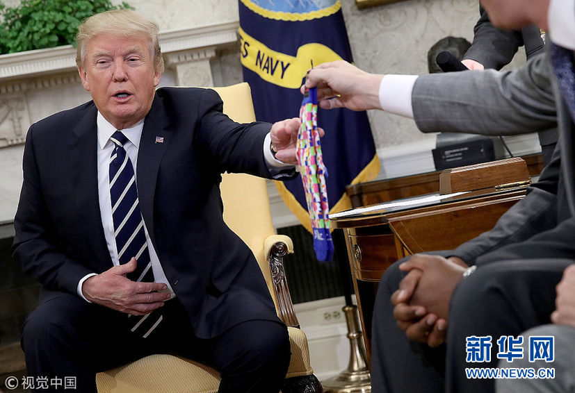 當地時間(jian)1月31日(ri),美國(guo)華盛頓(dun),美國(guo)總統特(te)朗普在白(bai)宮與公(gong)司雇員(yuan)討論稅收改(gai)革問題(ti),獲贈一雙襪子。(圖片來源(yuan):視覺中國(guo))
