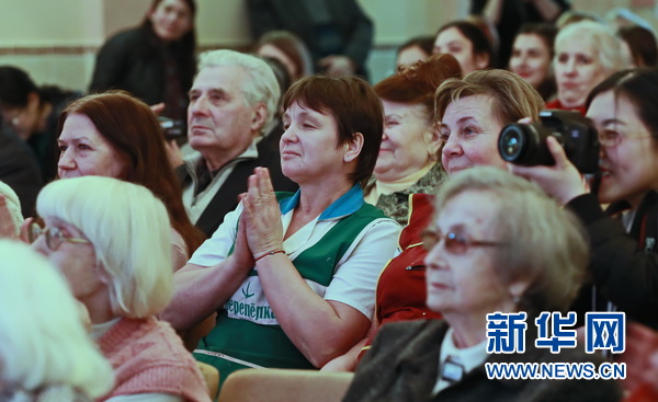 基輔市敬老院的孤殘老人們興致勃勃地觀看孔院師生帶來的文藝節目。新華網發(陳(chen)俊鋒(feng)攝)