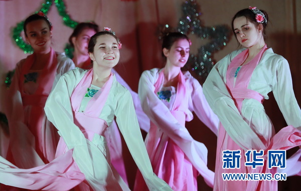 基輔國立語言大學孔子學院的學生表演中國舞蹈《采薇》。新華網發(陳(chen)俊(jun)鋒攝)