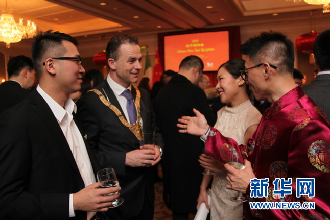 2月8日, 在愛爾蘭首都都柏林, 中愛嘉賓在中國駐愛爾蘭使館舉辦的春節招待會上交談。新華網發(張琪攝)