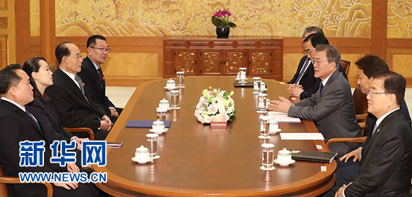 2月10日,在韓國首爾青瓦臺,韓國總統文在寅(右三)會見由朝鮮最高人民會議常任委員會委員長金永南(左三)率領的朝鮮高級別代表團。新華社/紐西斯通訊社