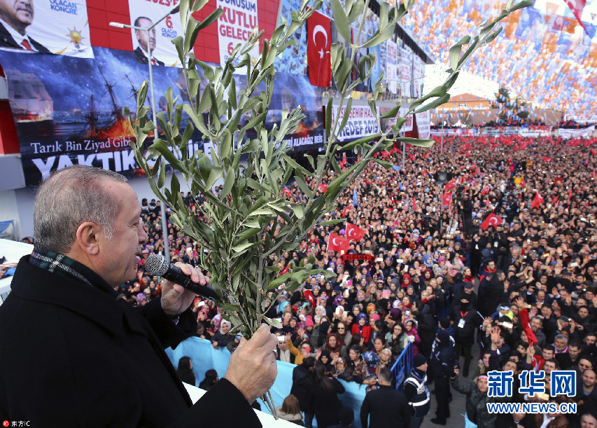 當(dang)地(di)時(shi)間2018年2月17日,土耳其埃斯基(ji)謝希爾,土耳其總統(tong)埃爾多安出席正義與發展黨集會,手持橄(gan)欖枝發表(biao)講(jiang)話(hua)。(圖(tu)片來源:東(dong)方IC)