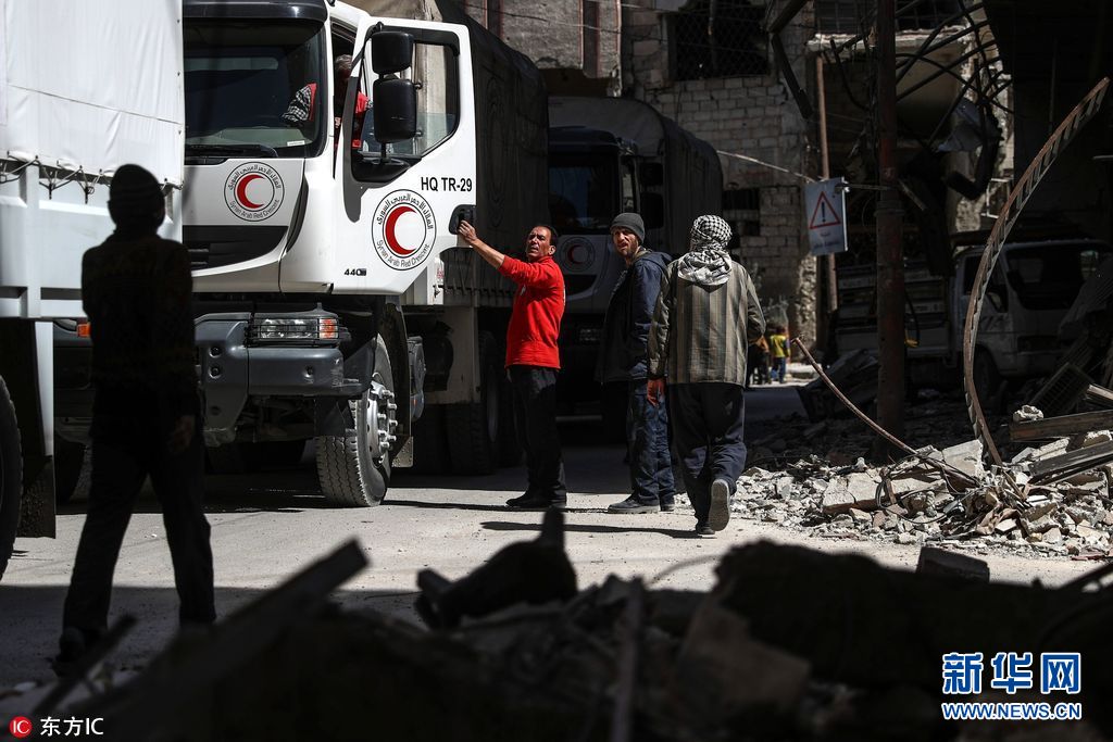 當地時間2018年(nian)3月9日(ri)(ri),敘(xu)利(li)亞,推遲多日(ri)(ri)后,人道主義救(jiu)援物(wu)資進入東古(gu)塔反政府武裝控(kong)制區并完成卸貨,共13卡(ka)車物(wu)資當天上午從瓦菲丁通道進入杜(du)馬(ma)區。(圖(tu)片(pian)來源:東方IC)