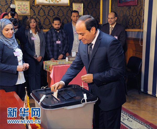 這張資料照片顯示的是,3月26日,塞西在埃及首都開羅一個投票站參加總統選舉投票。新華社/中東社