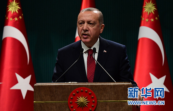 4月18日,土耳其總統埃爾多安在安卡拉舉行的新聞發布會上講話。新華社發(穆斯塔法·卡亞 攝)