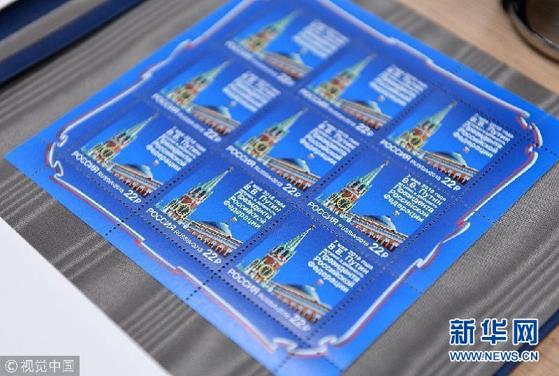 當(dang)地時(shi)間2018年5月7日,俄(e)羅斯莫斯科,俄(e)羅斯發(fa)行普京就職紀念郵票(piao)。(圖片來源:視覺(jue)中國)