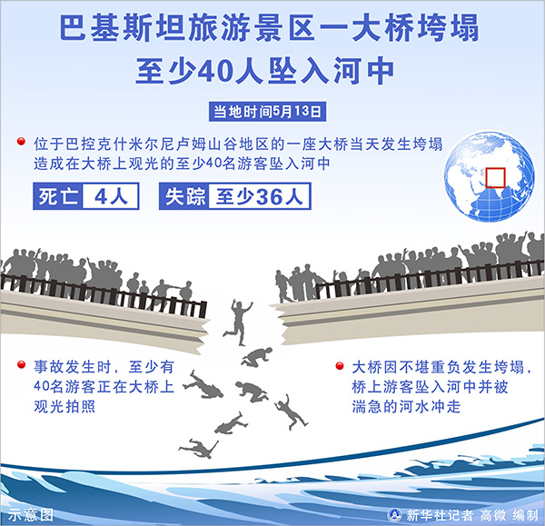 圖表:巴基斯坦旅游景區一大橋垮塌至少40人墜入河中 新華社記者 高微 編制