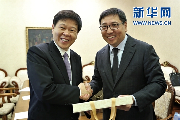 5月14日,在阿斯塔納,中國國家稅務總局局長王軍(左邊)在會議開始前與哈薩克斯坦副總理多薩耶夫舉行會晤。新華網發 阿比洛夫攝