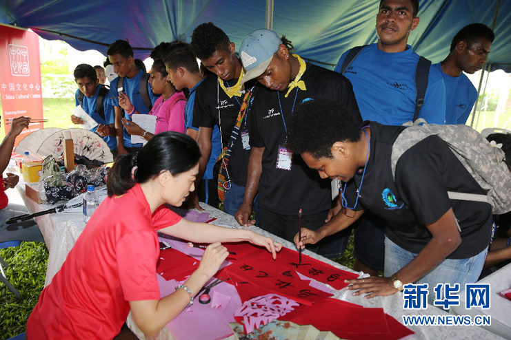 斐(fei)濟青年正(zheng)在中國文(wen)化中心(xin)老師的指(zhi)導下用毛筆(bi)寫自(zi)己的姓名(ming)。 新(xin)華網記者張永(yong)興 攝