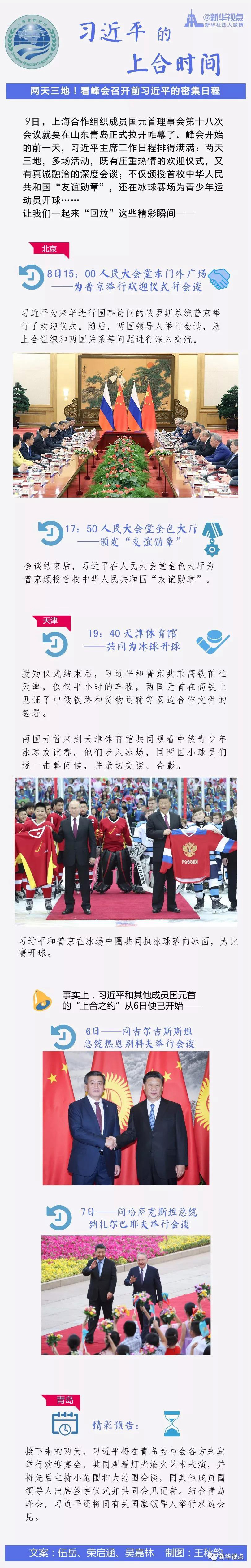 9日,上(shang)海合作(zuo)(zuo)組織(zhi)成員國元首理事會第十八次會議就要在山(shan)東青(qing)島正(zheng)式拉(la)開(kai)帷幕了。峰會開(kai)始的前一(yi)天(tian),習近平主席工作(zuo)(zuo)日程排得滿滿:兩天(tian)三地(di),多場活動,既有莊重熱情的歡(huan)迎儀式,又有真誠融洽的深度會談;不僅頒授(shou)首枚(mei)中華人民共和國“友誼勛章”,還在冰球賽場為青(qing)少年(nian)運動員開(kai)球……讓我(wo)們一(yi)起(qi)來(lai)“回放(fang)”這(zhe)些精彩(cai)瞬間????