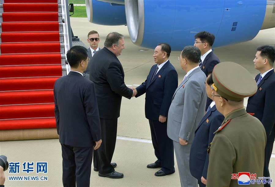 朝中社7月7日提供的照片顯示,美國國務卿蓬佩奧在朝鮮平壤與在機場迎接的朝鮮勞動黨中央委員會副委員長金英哲握手。新華社/朝中社