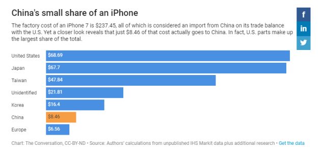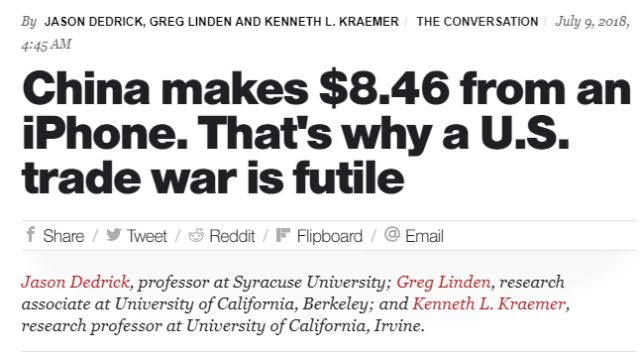 他們(men)給(gei)出(chu)的(de)理(li)由(you)則既簡(jian)單又引人(ren)矚(zhu)目:“因為中國(guo)每(mei)出(chu)口一個iPhone給(gei)美(mei)國(guo),只收入8.46美(mei)元”。