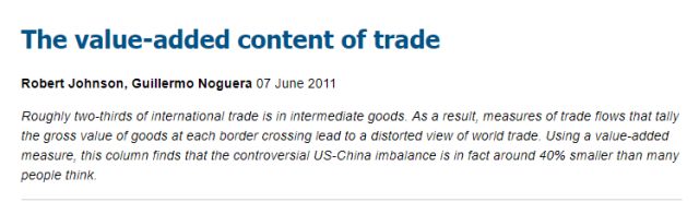這(zhe)家美國智(zhi)庫的觀點,也得到了(le)來自歐洲的智(zhi)庫“經(jing)濟(ji)政策(ce)研究(jiu)中(zhong)(zhong)(zhong)心”2011年一篇報(bao)告(gao)的佐證。報(bao)告(gao)中(zhong)(zhong)(zhong)的數據就顯示(shi),如(ru)果(guo)貿易逆差是按(an)照各個國家在產品中(zhong)(zhong)(zhong)實(shi)際的“附加價值”計算的話(hua),那(nei)么(me)中(zhong)(zhong)(zhong)美的貿易逆差將會大大縮減40%甚(shen)至更多。