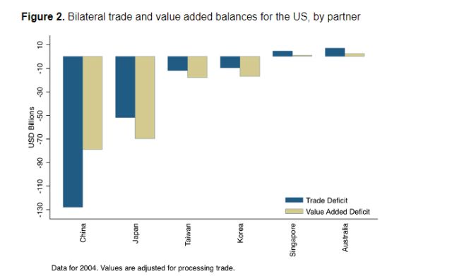 更(geng)引人注(zhu)目的(de)是(shi),如(ru)此計算(suan)的(de)話,那么比如(ru)2004年時日本(ben)(ben)和(he)美國(guo)的(de)貿易逆(ni)(ni)差就會暴(bao)增33%,直接(jie)逼近當時中(zhong)(zhong)美按這(zhe)種算(suan)法得出的(de)貿易逆(ni)(ni)差了——畢竟,在不少中(zhong)(zhong)國(guo)出口給美國(guo)的(de)產品中(zhong)(zhong),擁有(you)專(zhuan)利技術的(de)日本(ben)(ben)的(de)“附加價值(zhi)”是(shi)很高(gao)的(de)。