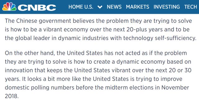 特朗普真(zhen)正在(zai)意的(de)問題,并不是(shi)(shi)創(chuang)(chuang)造一(yi)個活躍創(chuang)(chuang)新的(de)經濟(ji),好讓美國(guo)在(zai)未(wei)來(lai)20-30年繼(ji)續(xu)保持領(ling)先,他(ta)在(zai)乎(hu)的(de)只是(shi)(shi)11月中(zhong)期選舉的(de)投票數字;另一(yi)方(fang)面,中(zhong)國(guo)政(zheng)府在(zai)意的(de)問題,反(fan)倒是(shi)(shi)如(ru)何令其(qi)經濟(ji)在(zai)接下來(lai)的(de)20年里保持活力(li),從(cong)而令中(zhong)國(guo)成為一(yi)個引領(ling)世界、科技上自主獨(du)立的(de)國(guo)家。