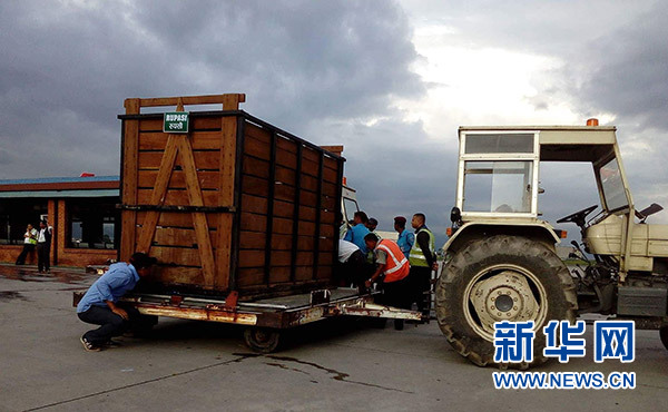 7月12日,在尼泊爾首都加德滿都特里布萬國際機場,工作人員在運送裝有犀牛的木箱。新華社發