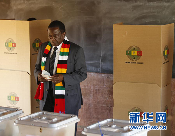 7月30日,在津巴布韋奎奎市,總統姆南加古瓦在一處投票站參加投票。 新華社發(肖恩·朱薩攝)