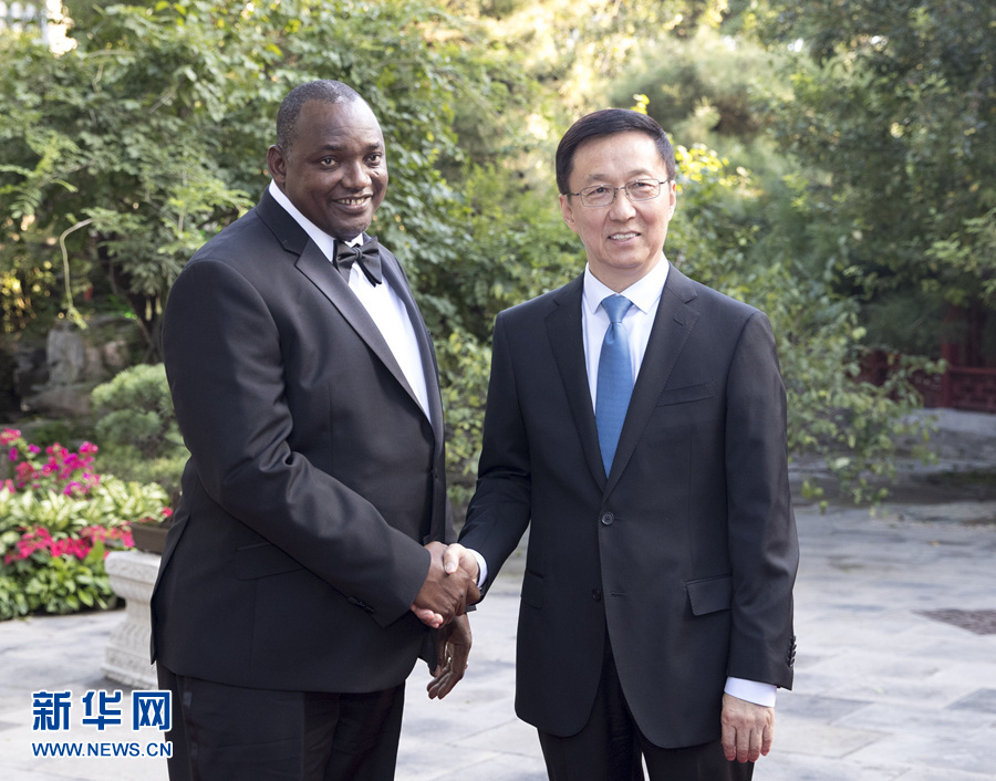 9月6日,中共中央政治局常委、國務院副總理韓正在北京釣魚臺國賓館會見岡比亞總統巴羅。 新華社記者 王曄 攝