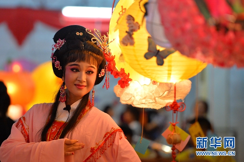 9月24日晚,文萊華人社團在斯里巴加灣市中心舉辦慶中秋燈會和傳統戲曲表演,吸引民眾駐足觀賞。圖為閩劇團演員在燈會上表演傳統戲曲。杰弗里·黃攝