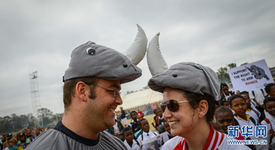 這對會心微笑的情侶戴著犀牛角卡通帽