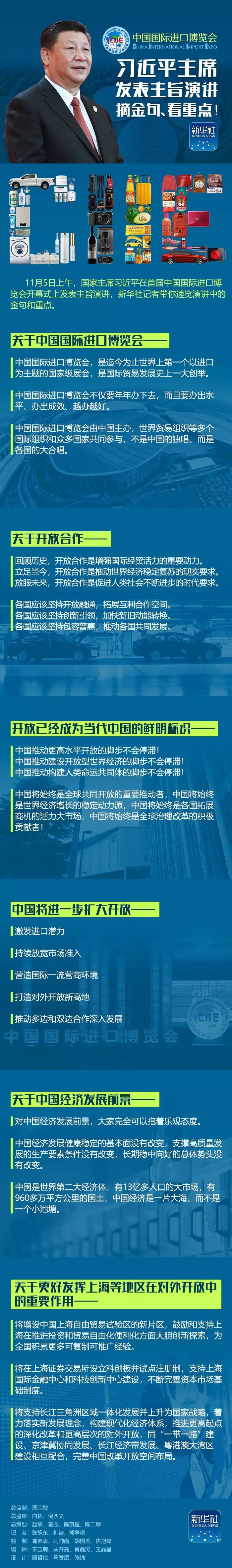 今年4月,在博鰲亞(ya)洲論壇年會開幕(mu)式上,習近平主(zhu)席亮(liang)出擴大(da)開放(fang)的一(yi)系列舉措。在此基礎上,習近平主(zhu)席此次宣布了中(zhong)國進一(yi)步擴大(da)開放(fang)的五項新舉措:激發(fa)進口(kou)潛力(li)、持續放(fang)寬市場準入、營造(zao)國際(ji)一(yi)流營商環境、打造(zao)對外開放(fang)新高地、推動(dong)多邊和雙邊合(he)作深入發(fa)展(zhan)。