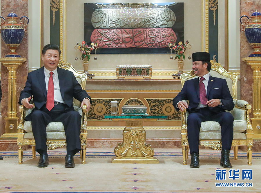 11月19日,國家主席習近平在斯里巴加灣同文萊蘇丹哈桑納爾舉行會談。這是習近平同哈桑納爾親切交談。新華社記者 鞠鵬 攝