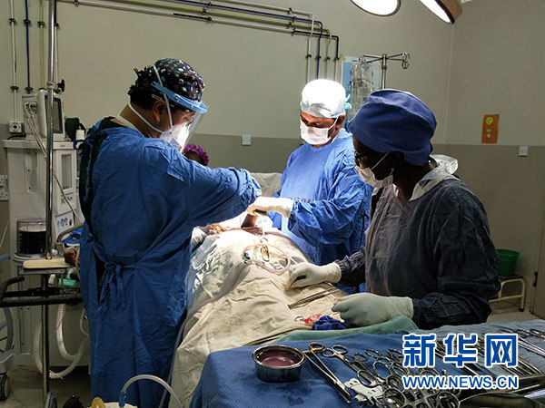 這張2018年8月21日拍攝的照片顯示,在馬拉維首都利隆圭的卡姆祖中心醫院,中國醫療隊婦產科醫生為當地民眾實施手術。新華社發(第六批中國援馬拉維醫療隊供圖)