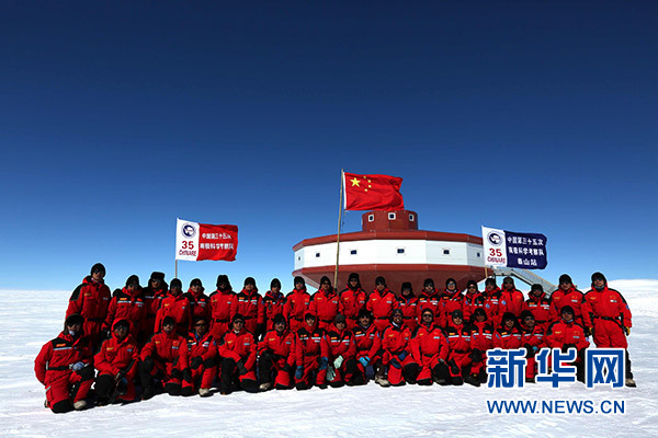 12月26日,中國第35次南極科學考察隊內陸隊(泰山隊和昆侖隊)隊員在泰山站主體建筑前升國旗合影。 新華社記者 劉詩平 攝