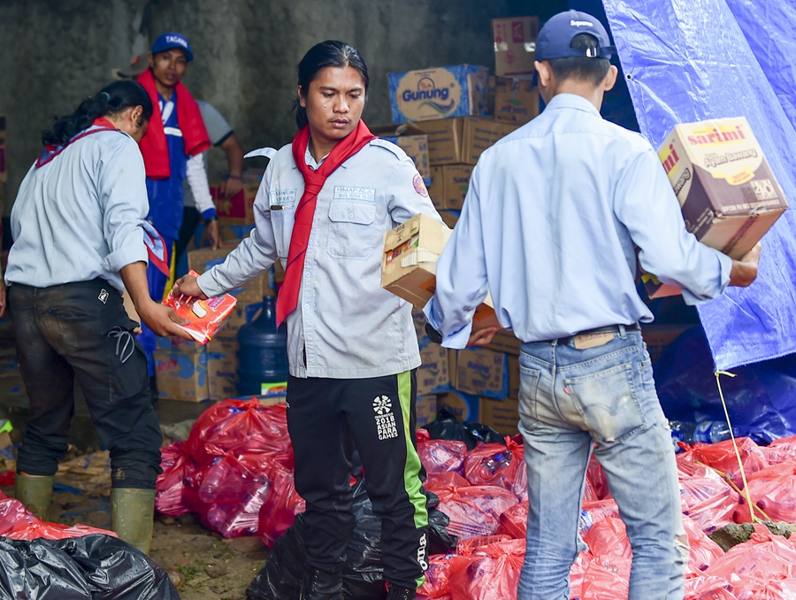 12月25日,在印度尼西亞萬丹省板底蘭縣的災民安置點,參與賑災的工作人員為災民搬運食物。新華社記者杜宇攝