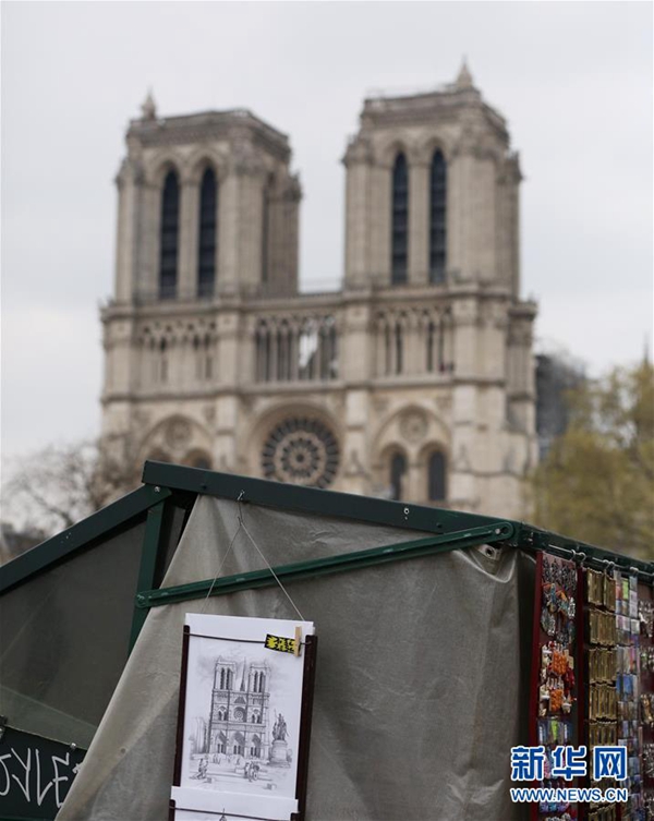 這是4月16日在法國巴黎拍攝的火災后的巴黎圣母院以及書攤上售賣的圣母院圖片。法國總統馬克龍16日晚針對巴黎圣母院嚴重火災發表簡短電視講話,表示希望在五年內重建巴黎圣母院。新華社記者 高靜 攝