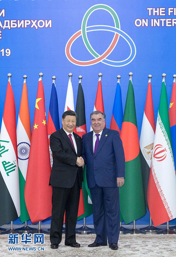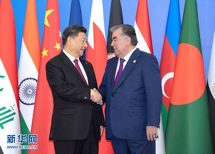6月15日,亞洲相互協作與信任措施會議第五次峰會在塔吉克斯坦首都杜尚別舉行。國家主席習近平出席峰會并發表重要講話。這是習近平抵達納烏魯茲宮迎賓廳,受到塔吉克斯坦總統拉赫蒙熱情迎接。 新華社記者 沙達提 攝