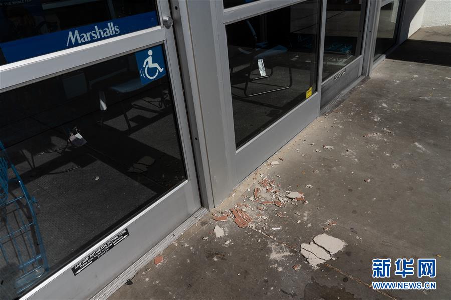 7月4日,在美國加利福尼亞州里奇克雷斯特,一家商店門口散落著墻體碎片。美國加利福尼亞州南部4日上午發生6.4級地震,洛杉磯地區有明顯震感,部分區域道路開裂,但目前沒有人員傷亡的報道。新華社發(錢衛忠攝)
