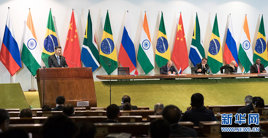 當地時間11月14日,金磚國家領導人同金磚國家工商理事會和新開發銀行對話會在巴西利亞舉行。中國國家主席習近平、巴西總統博索納羅、俄羅斯總統普京、印度總理莫迪、南非總統拉馬福薩共同出席。這是習近平發表講話。 新華社記者 李學仁 攝
