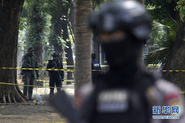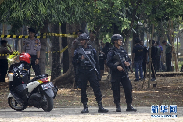 12月3日,在印度尼西亞雅加達,警察在爆炸現場警戒。新華社發(阿迪蒂亞·伊拉萬 攝)