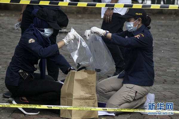 12月3日,在印度尼西亞雅加達,警察在爆炸現場收集物證。新華社發(阿迪蒂亞·伊拉萬 攝)
