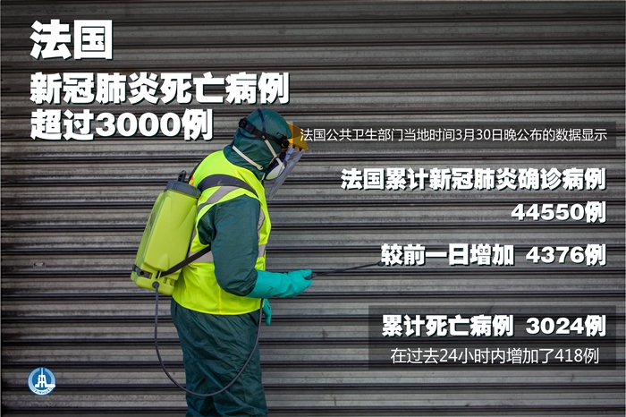 新華社巴(ba)黎3月(yue)30日電(dian)(記者陳晨)法國公(gong)共衛生部門30日晚公(gong)布的(de)數據顯示,法國累計新冠肺炎確診病例(li)(li)44550例(li)(li),較前一日增加4376例(li)(li);累計死亡病例(li)(li)3024例(li)(li),在過去24小(xiao)時內增加了(le)418例(li)(li)。