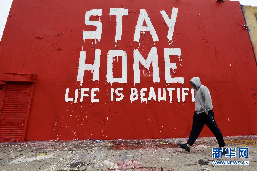 4月9日,一名男子經過美國洛杉磯市區內的防疫主題的壁畫。 為減緩新冠病毒的傳播,洛杉磯市長7日下令,民眾在公共營業場所要戴口罩或用織物遮擋住臉,這一行政令于2020年4月10日生效。 新華社發